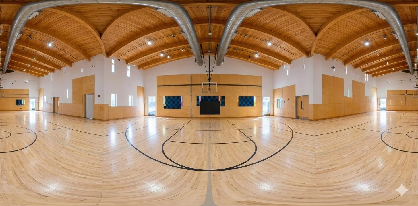 Drag in any direction — up, down, left, right — to explore every corner of our full-size gymnasium before you book.